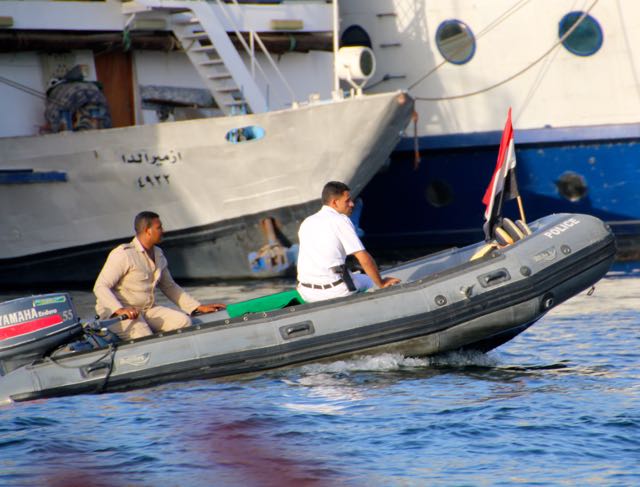 Security is important here…as we sailed we first noticed our tourist armed security who actually accompanited us everywhere since our arrival. Plus, two 2-manned military zodiac boats trailed our sailboat on the Nile. Sa’id, our security man, was wearing a vest which nearly concealed his MP4-submachine pistol. (For added measure he carries a 30 round spare clip in his left rear pocket).