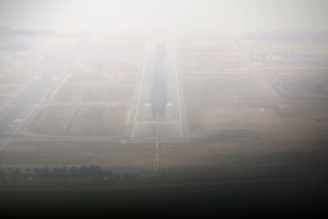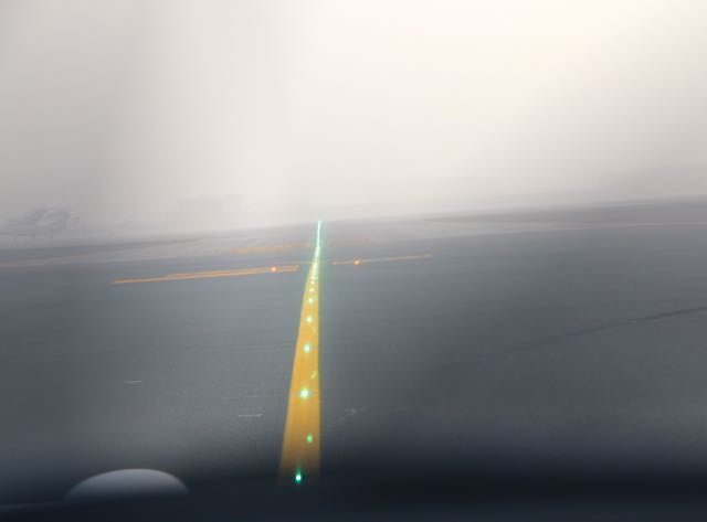 Dubai: IFR approach to final…last minute visual of RAIL lights (at 400 ft.). No photos of final approach, but it was a perfect landing! Following taxi directions to parking is another challenge — great system of green lights to direct us.