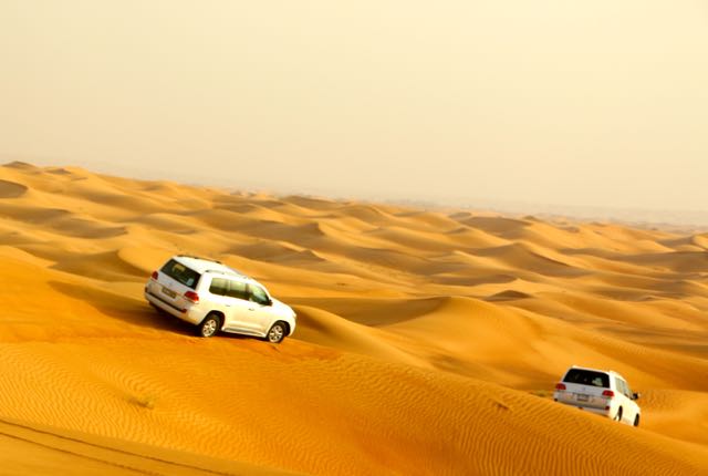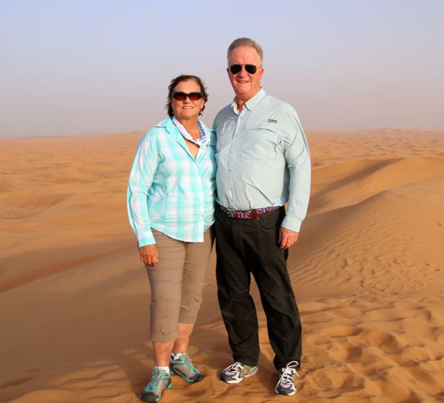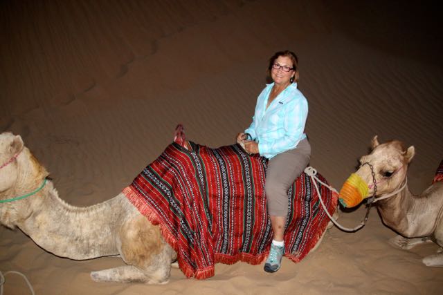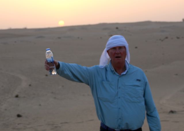 Later we boarded a Toyota 4 wheel drive SUV, drove about 45 minutes to “enjoy” a thrilling ride: Sand Dune Bashing! Tom & I selected the trailing car (mildest ride). Diann was definitely queasy by the time we reached the “camp” for drinks and snacks. Coca Cola worked wonders to settle the stomach. Diann was ready to ride a camel.