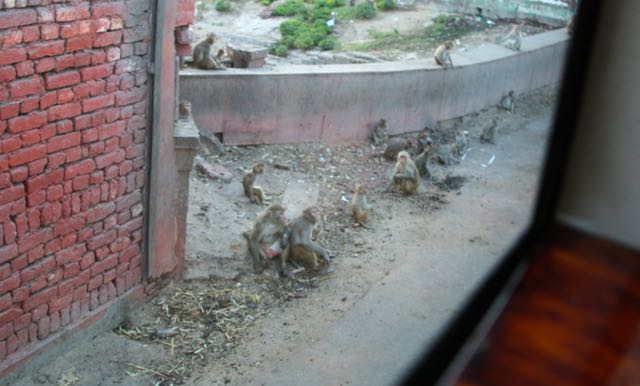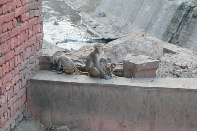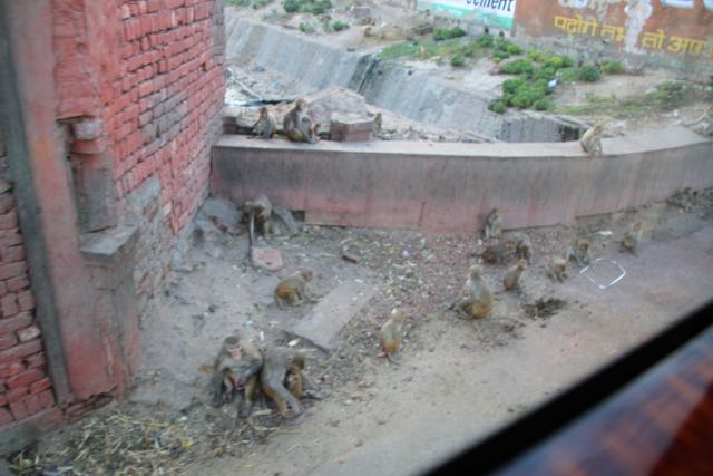 And then there were the “street monkeys”…driving through Agra to get to and from our Fort tour was itself an eye opening event. At first it seem so cute to see the little monkeys in the street, gutters, on top of roofs—EVERYWHERE! Soon it seems as they are rats living in the gutters, scrounging for food. The people feed them regularly because, much like the cow, monkeys are revered animals. The bus driver opened the door (thinking we wanted totake more photos) and the stench was aweful!! Sorry I sat in the first row seat!!